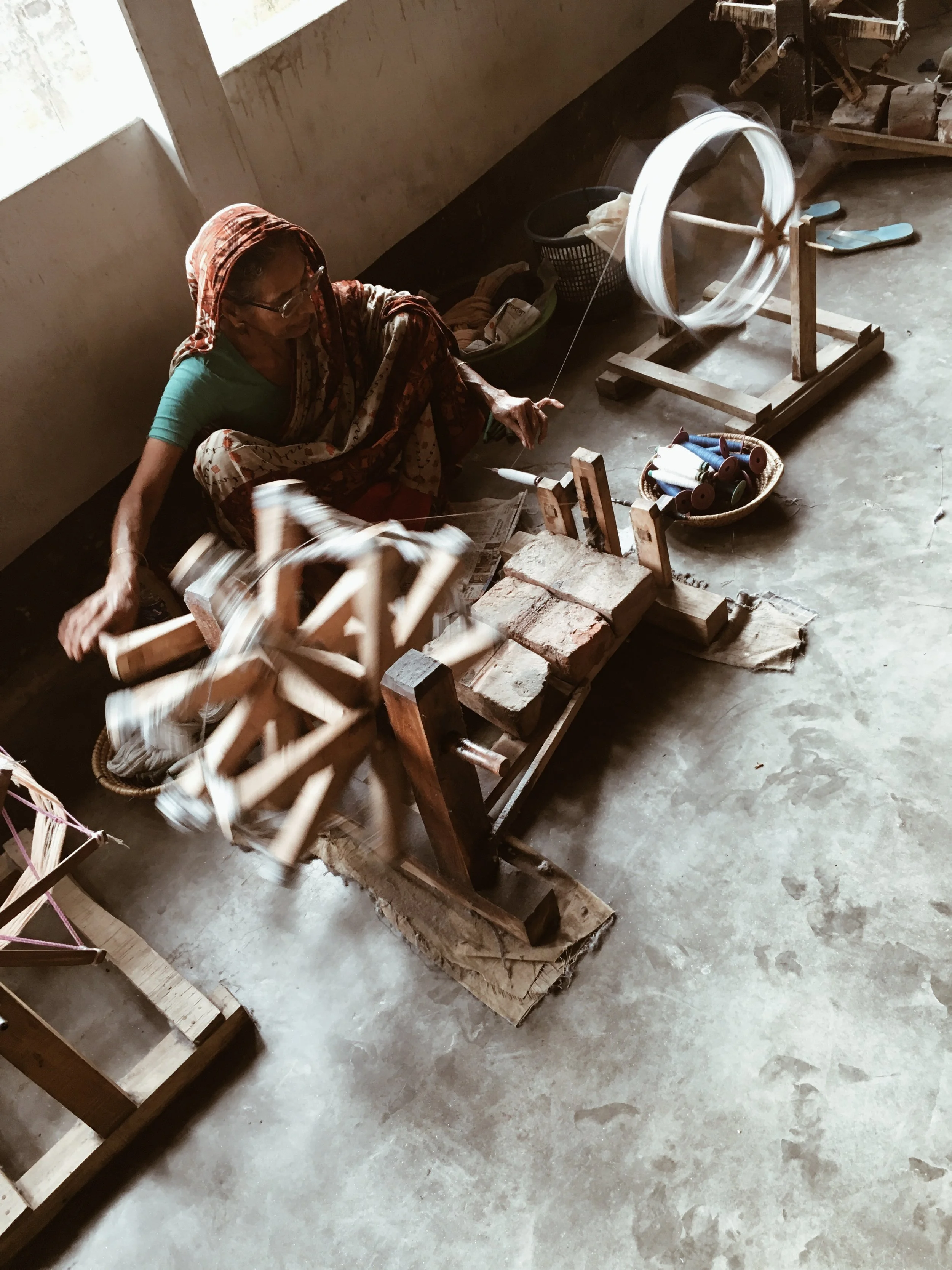 - Within a long room 15+ older women sit on small stools using a spinning machine to make the bobbins ready for weaving.
