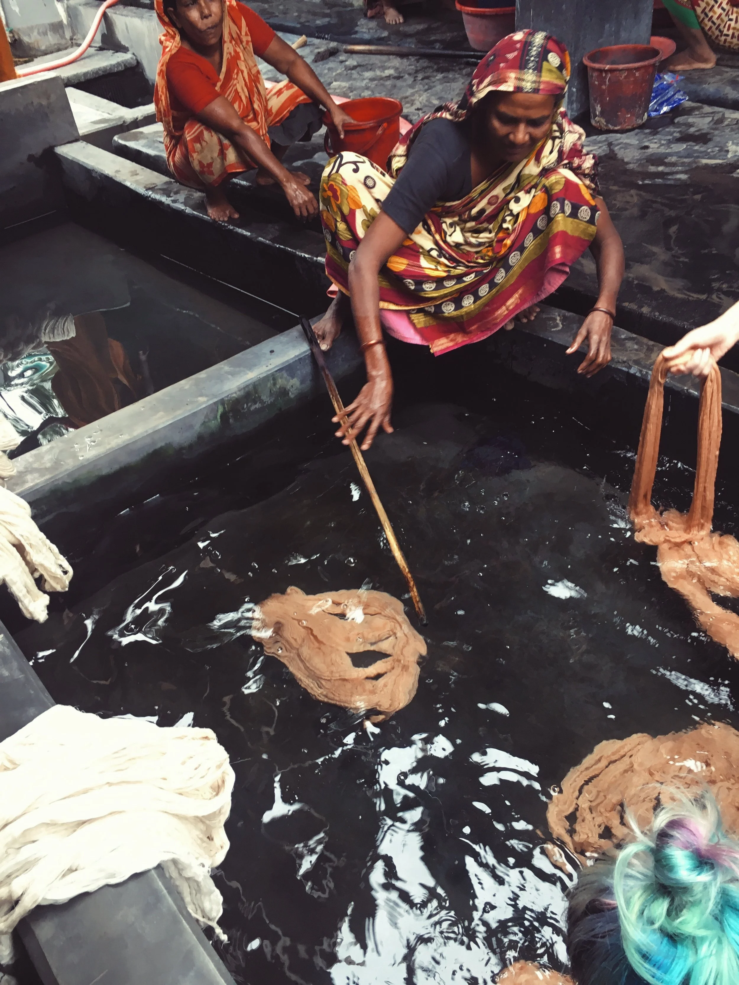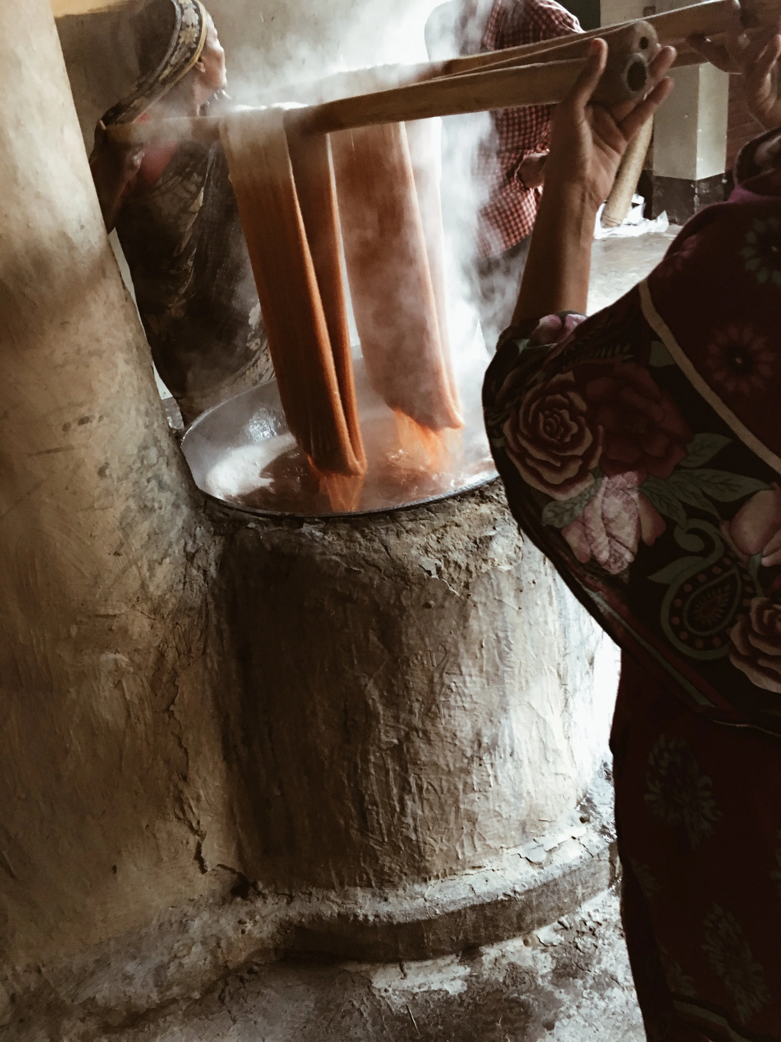 Watched the tour guide measure the dye out as per book instructions and pour the dye into the hot clay pot. We each had a turn at using the long bamboo sticks to turn the loops of yarn through the dye pot. The regular women made this look so easy!